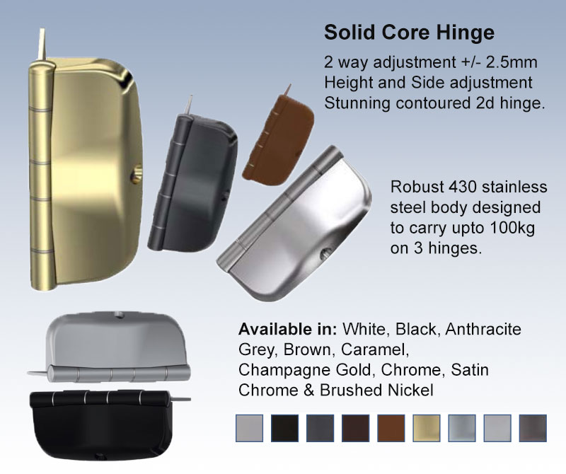 The hinges are Face Fix slimline heavy duty for ease of installation. These hinges automatically set the correct compression so no need for adjustment. They allow adjustment to be made horizontally and vertically to +/- 2.5mm.