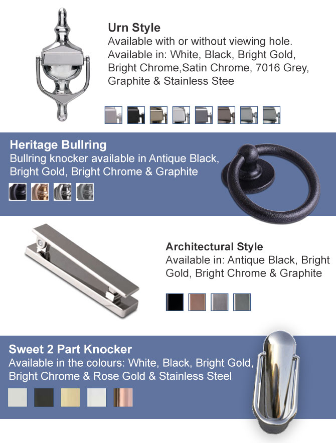 Knockers are matched to your handle colour, so to change the knocker colour please change the handle colour.
