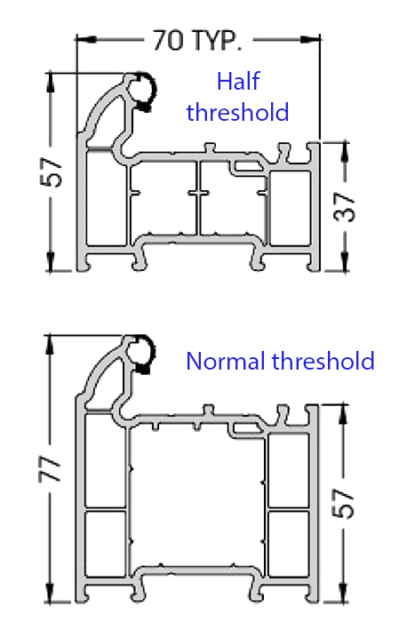 Normal UPVC threshold 57 to 77mm high (not including any optional cill), with the benefit of a better seal and insulation.